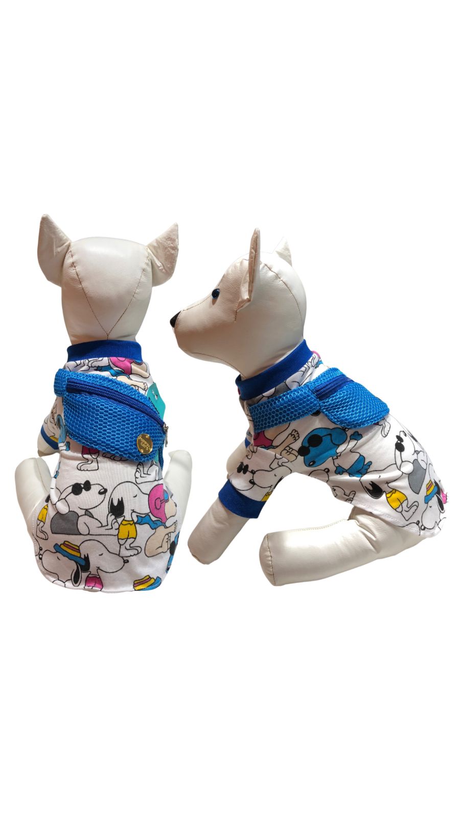 Super estilosa e funcional, essa camisa é perfeita para pets descolados! Confeccionada em tecido leve e confortável, possui estampa divertida com o Snoopy em várias poses. Acompanha uma pochete azul acoplada com telinha respirável, ideal para dar um charme extra e até guardar pequenos petiscos ou saquinhos higiênicos.